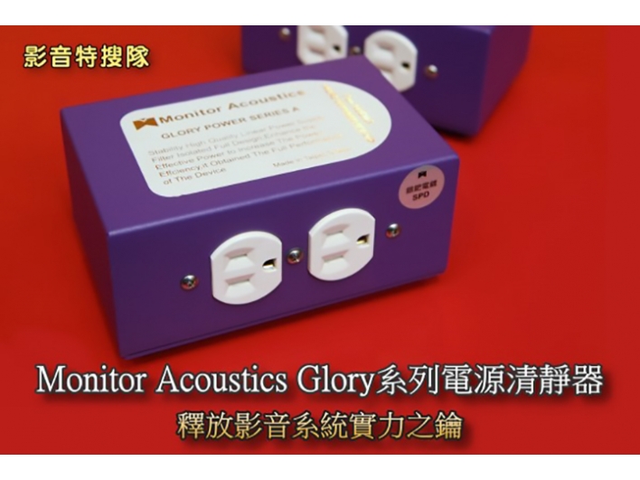 以不同顏色的外殼區分,Glory系列分為For Audio音響器材專用的Glory A,以及For Video影像器材專用的Glory V,此兩者又各區分為「基本款」與「進階款」,後者「進階款」分別以Glory AGR與Glory VGR的型號標示。在過去,全世界所有電源濾波處理產品,全都只針對交流電源的火線及水線處理,如此由地線所串入的干擾與噪訊仍會竄入火線,對音質與畫質產生劣化影響;Monitor Acoustics Glory系列的「進階版」(也就是Glory AGR與Glory VGR)是全球首度將「迷你接地器」納入的創新製品,透過特製的地線濾波器,將地線串入的干擾與噪訊排除。就音響系統的音樂重播而言,高低兩端的頻寬會明顯拓展、音像更扎實、低頻與極低頻的線材更清晰。影像方面,畫面的景深、層次與明暗對比大幅提升,色彩的純度與階調也更為分明,尤其對畫面四角邊緣區域的畫質增進更明顯。為何能如此?答案很簡單,Glory電源清靜器就是將交流電源裡原本不該有的噪訊予以排除而已,讓視聽器材內的電路不受到干擾、正常運作,發揮原本就該有的影音實力。