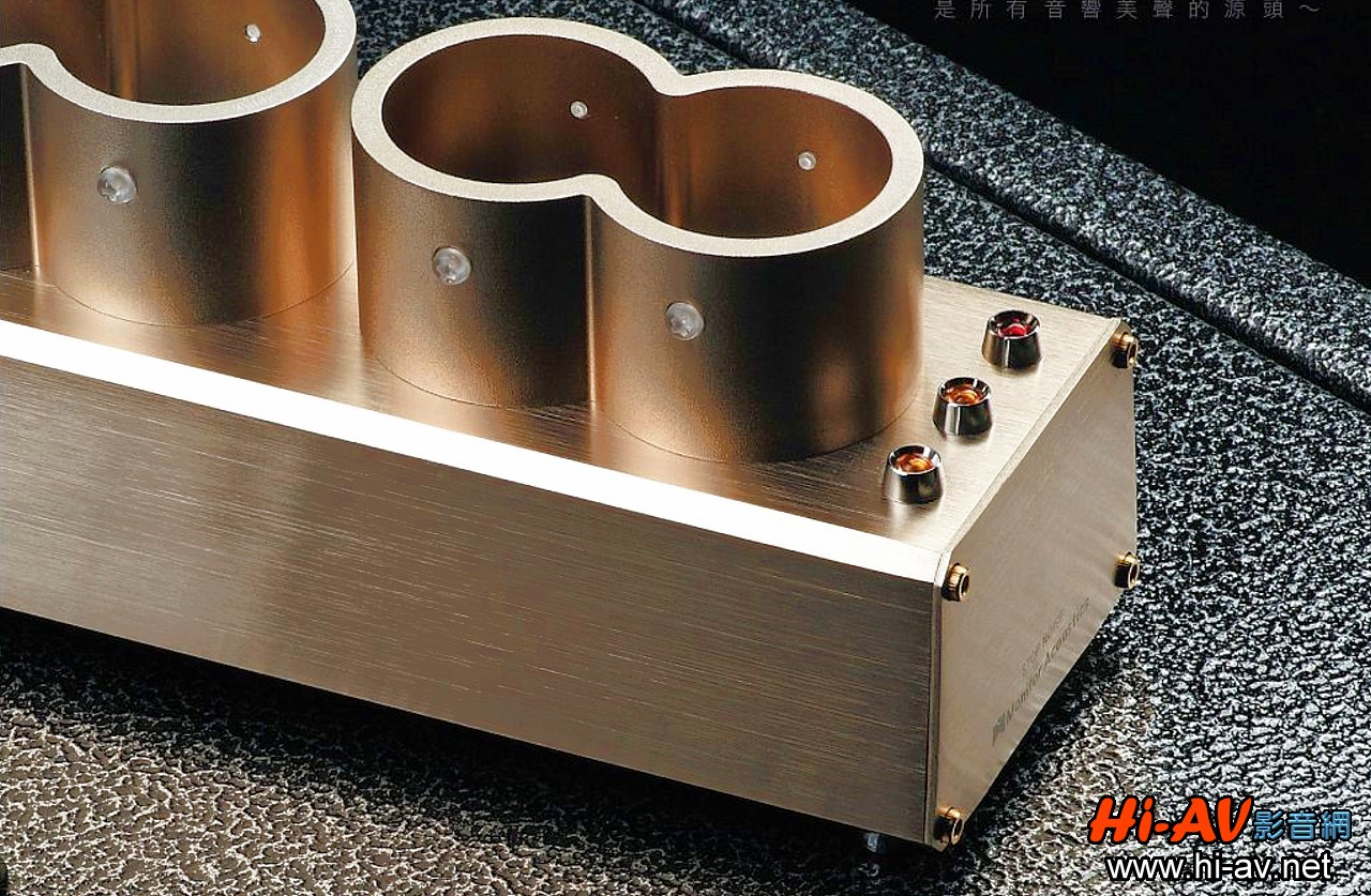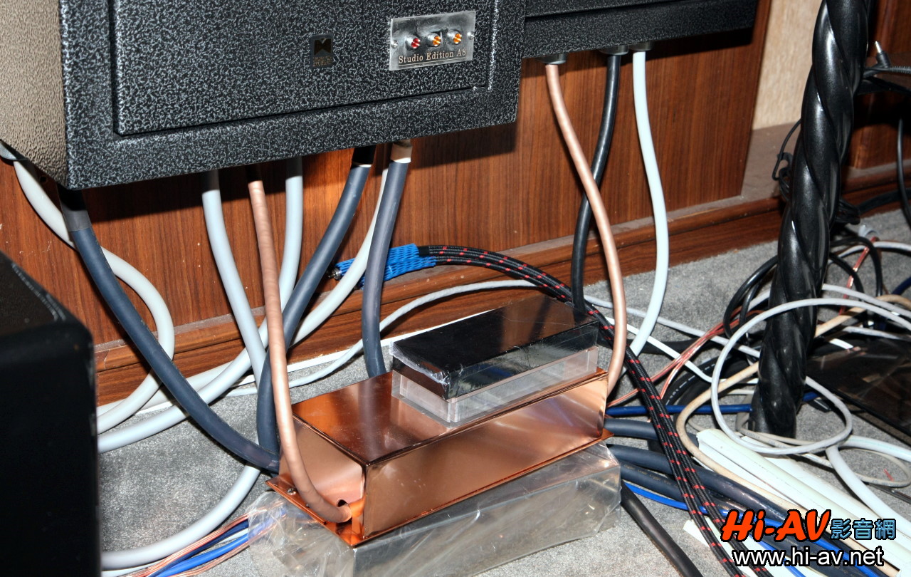 兩個專業電箱底下這個長方形紅銅外殼物件,是Monitor Acoustics的「接地濾波器」(Power Block Ground Filter),由於一般住宅大樓接地路徑動輒數十米,接地阻抗很難降到極低,讓接地效果難免打折扣。但是,透過這個「電箱接地器」,就可有效降低接地磁場,即使接地阻抗仍高,依舊可得到乾淨有力的聲音能量表現。Glory ARG與Glory VGR電源清靜器裡面,就有運用到相關的技術研發成果。