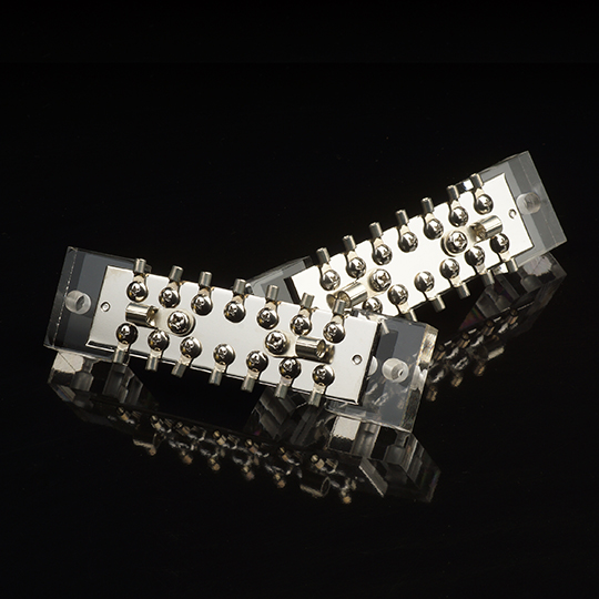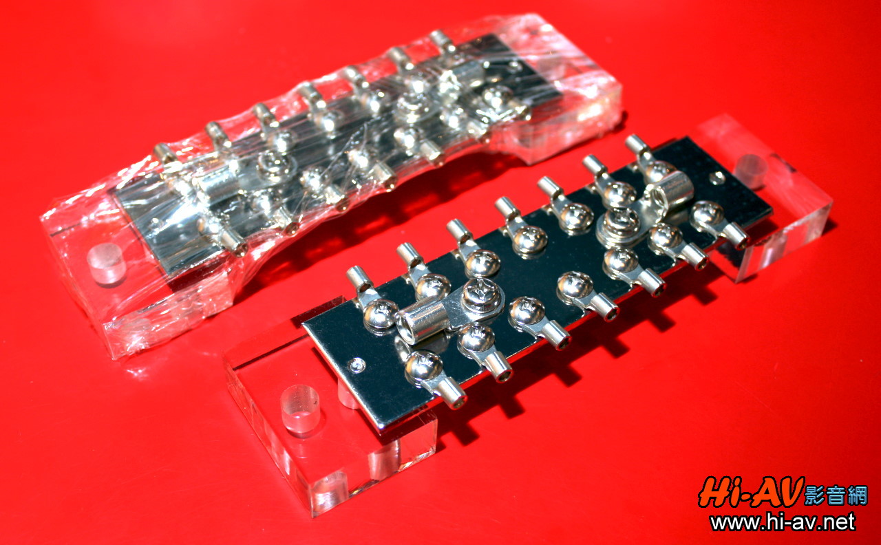 每個「PG-16匯流板」上有16mm2 O型環端子兩組與4mm2 O型環端子十四組,它們都同樣經過與匯流板一樣的奈米研磨與鍍銀鍍鈀處理,如此多的端子群當然足夠絕大多數視聽音響空間使用。另一方面,所有螺絲皆為不銹鋼、不導磁材質,這也是追求最高音質之考量,此外3mm厚的匯流板左右兩側都有一塊厚壓克力基座,可發揮適度的抑震效果。