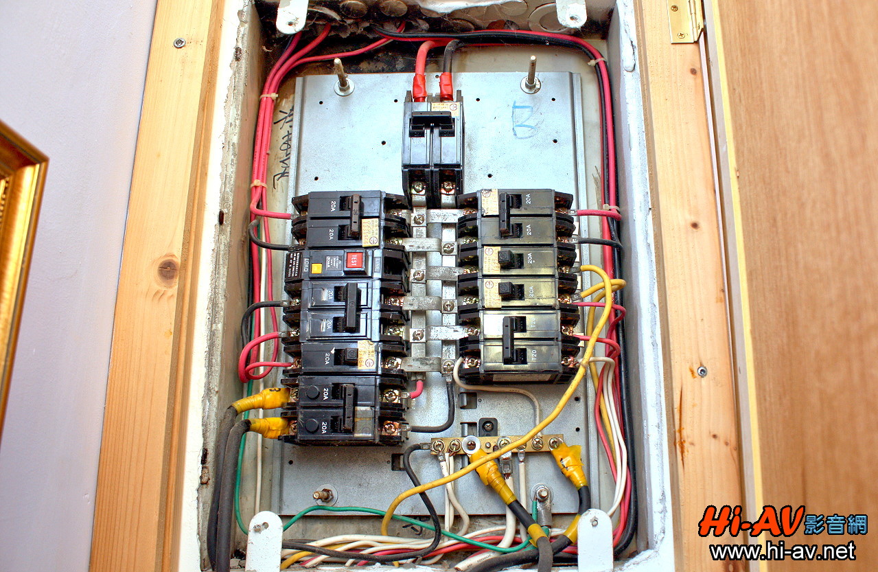 上圖是一般公寓大樓沒有接地處理的電源箱,水線匯流板就是右下角那條輕薄的長條型銅板,無論導電效率或抑震都很差,與電源火線的距離十分接近又沒有屏蔽,對音場透明度及高頻的清晰度都明顯有害,只要換上Monitor Acoustics新推出的「PG-16匯流板」,音響系統的聲音表現就能有明顯的全面改善。