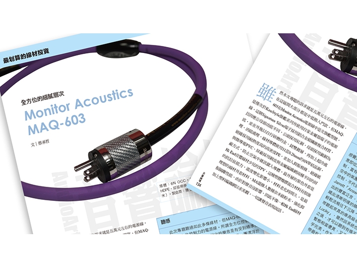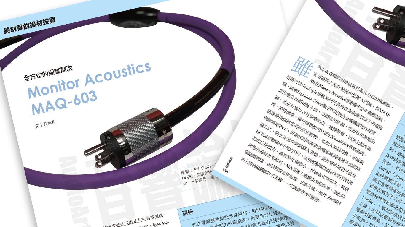 此次專題聽過如此多條線材,但MAQ-603是能夠感覺到全方位控制力的電源線。所謂全方位控制力,意即從高頻到低頻,所有拋出的樂音是有受到精準控制,富有層次感的。比如人聲唱歌不再是一團漂浮於空中的氣團,而是能感受到立於地面的立體度。所謂控制,不代表聲音缺乏活力;而是剛好相反,聽Keith Jarrett「Answer me my love」,空氣中滿佈拋撒而出的豐富泛音,塑造空靈的獨特氛圍。綿密的鍵觸編織出清晰明確的韻律節奏,更不容易的是低音鍵能夠輕鬆流暢往下沉降。在本次專題中,這應該是少數鋼琴聽起來真的像高級名琴的一次。聽Daft Punk「Get Lucky」,雖然說系統也有關係,但只有上MAQ-603之後,才可以聽到有條不紊的電子節奏。重點是瞬間暫態相當優異,又不失該有的厚度,在此曲上表現幾乎完美。作為MA次旗艦,MAQ-603幾乎就是這價位帶最有價值的選擇。全文出自 音響論壇 414 期