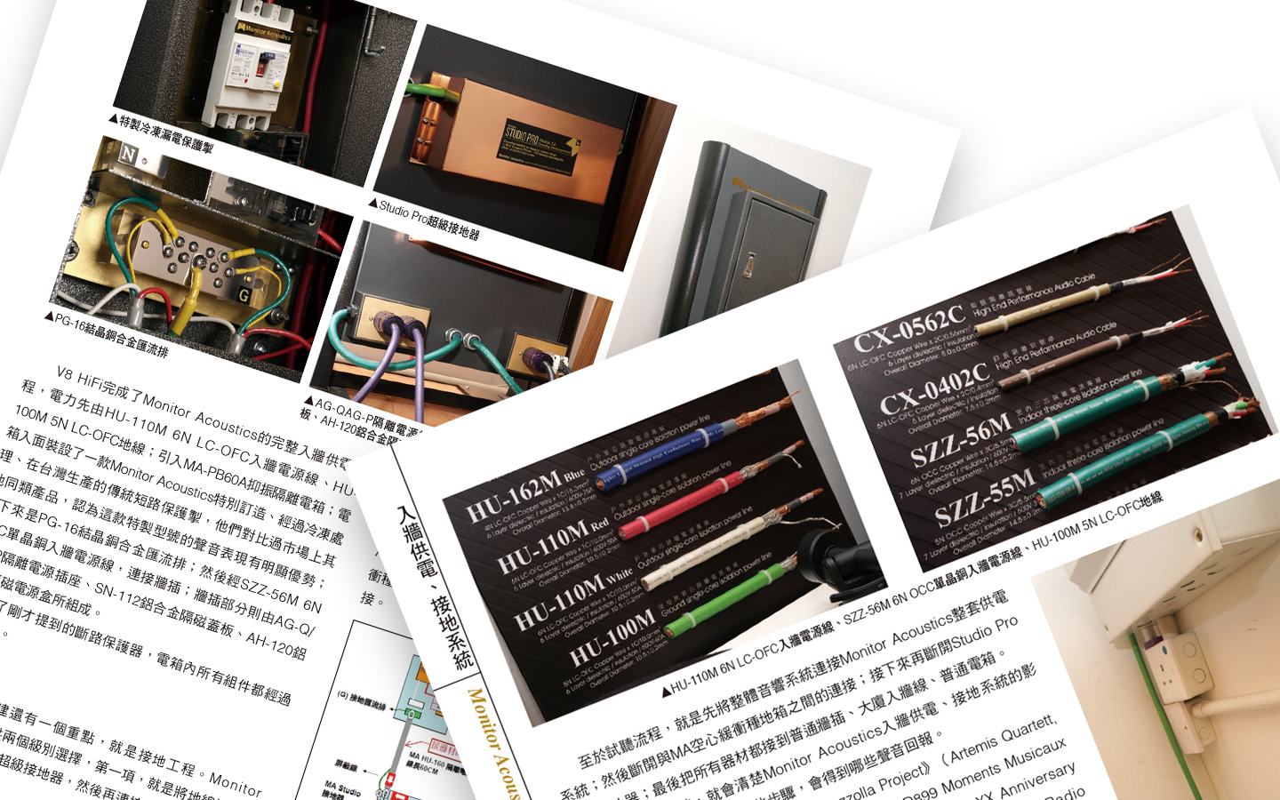 V8 HiFi完成了Monitor Acoustics的完整入牆供電工程,電力先由HU-110M 6N LC-OFC入牆電源線、HU-100M 5N LC-OFC地線;引入MA-PB60A抑振隔離電箱;電箱入面裝設了一款Monitor Acoustics特別訂造、經過冷凍處理、在台灣生產的傳統短路保護掣,他們對比過市場上其他同類產品,認為這款特製型號的聲音表現有明顯優勢;接下來是PG-16結晶銅合金匯流排;然後經SZZ-56M 6N OCC單晶銅入牆電源線,連接牆插;牆插部分則由AG-Q/AG-P隔離電源插座、SN-112鋁合金隔磁蓋板、AH-120鋁合金隔磁電源盒所組成。