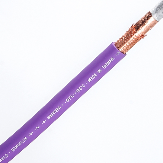 The outermost jacket is formed from a deep violet TPV (Thermoplastic Vulcanizate)—but not just any TPV. This advanced compound is infused with functional nanomaterials, including infrared-active nano-powders that enhance isolation, suppress vibrations, and subtly aid in power transmission. The result is a cable jacket with a unique tactile finish, excellent grip, low compression set, and outstanding elasticity—all while being eco-friendly and recyclable.