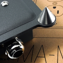 因此,設計出「MA-M2s」高端插座底座,核心訂製全新的單座鋁合金壓鑄盒,能有效阻隔EMI、RFI的電磁干擾,並具備穩定結構與極低諧振等特性優勢,讓電源不受外在干擾。而為求能夠靈活擺放、並且穩重安定,我們訂製了一片厚5mm的高壓鍘型碳鋼底板(約重1公斤)來與電源盒結合,用以強化底盤的重心與穩定性,我們在選擇碳鋼底板時,為了提拉出碳鋼底板最佳性能,能夠將抑振、制震、消震、導振等基石特性表現的淋漓盡致,特別要求供料商訂購符合MA標準的含碳量,因為含碳量相差0.05%,整體的特性表現就完全不一樣,我們選擇最適合的強度、硬度、比重與韌性表現的碳鋼原材(機密),經過初次鍘型、高壓壓模、再經過多道工序製程,在整體調校完成後,才送去烤漆做表面處理。而表體的烤漆處理也藏有不凡材料,外觀採用新一代的消光灰閃砂紋呈現,但在烤粉的配方中我們「照例」加入數種奈米粉末,種類、比例、色階、粉體都有嚴格的要求,不外傳的獨家秘方中,隱藏著特殊的性能在裡面,可別以為這只是單純的防護烤漆,對於細節就算是表面烤漆我們也不輕易放過,這也是為什麼別人追趕不上MA的原因之一。最後,我們在碳鋼底板的四個角下,裝配經過熱處理、不感磁的高強度不鏽鋼角錐,一來將電源盒墊高離地,消弭來自地面的震動,並隔絕微振干擾;二來不鏽鋼不導磁的特性,隔絕了亂竄的電磁干擾,降低污磁侵擾的機會。若您也正在尋找優質的電源插座底座,「MA-M2s」絕對是您最好的選擇,用家還可搭配IG AG-P2/Q2、New Glory SN-112一起,讓穩若磐石的「MA-M2s」將靚電無染地導入您的系統之中,音樂中的細節、層次、景深、音場必將展露無遺,現在自己動手DIY,一起輕鬆享受端正無染、高品質的電源吧。