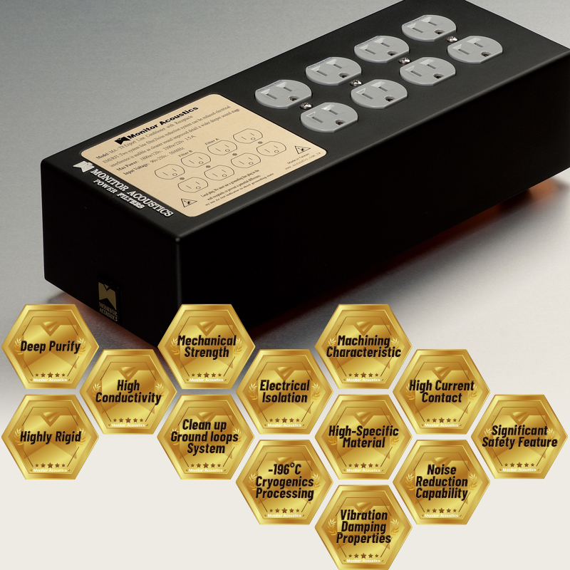 Monitor Acoustics 靜神專研電源處理多年,旗下最暢銷的產品非濾波排插莫屬。而T-8 Gold breaker(配置電源開關)更是MA靜神中階款式中的平價之作,其用料與結構毫不馬虎,外殼由純鋁合金鑄製而成,底部覆以鍍銅鐵板。內部配置了四個AG-M Gold,共八個插孔採以分流式供電,切分為Analog及Digital兩組電路,一組兩個AG-M Gold採用電源直通,提供給類比、後級、管機等器材使用,另一組兩個AG-M Gold則是經過電源淨化電路,提供給對於電源較為敏感的數位器材,用家可以依照器材屬性使用,並且減少插座間的相互影響。此外,一旁還藏了一片虛擬接地板,強化接地電位,讓電源傳輸更加流暢。加上AG-M Gold內部金屬導件,皆有經過超低溫冷凍處理、奈米精密研磨等等,嚴謹的工序一項也沒省,就能讓玩家用少少預算,聲音就有明顯的改善,同時也提升音響的玩賞樂趣。