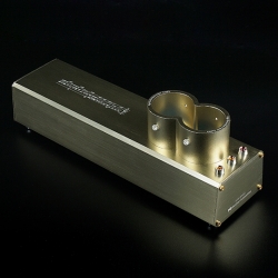 特殊造型的鋁合金隔離外殼,上頭搭載一組IG AG-Q電源插座,提供兩個電源插孔,提供最佳電源能量,減少器材間的相互干擾。