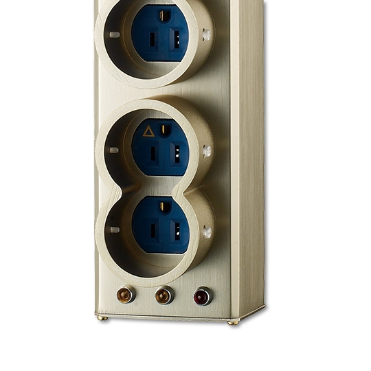 特殊造型的鋁合金隔離外殼,上頭搭載兩組IG AG-Q電源插座,提供四個電源插孔,提供最佳電源能量。