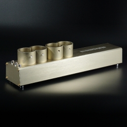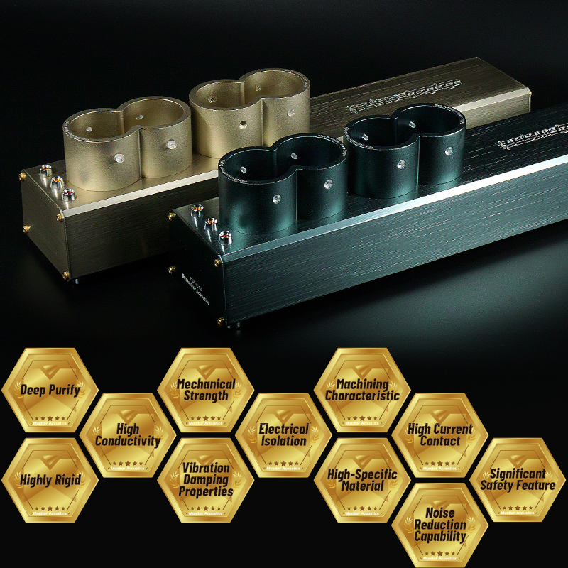 - Pig-nose-style aluminum power barrel design, with non-magnetic plastic screws on both sides of each socket to securely anchor high-end power plugs