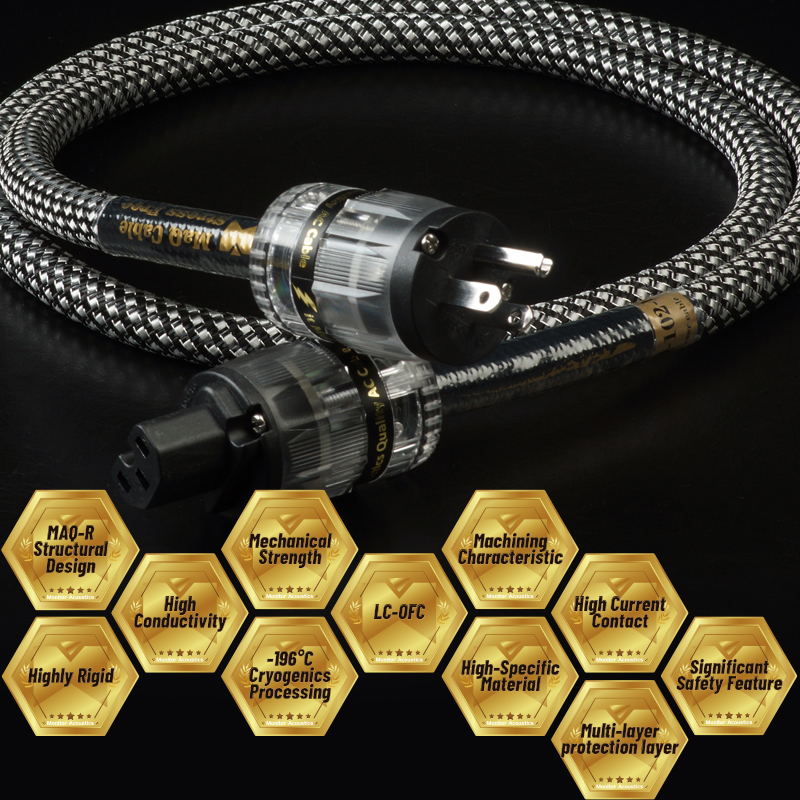 MA靜神旗下的「MaQ-102-R」入門款隔離電源線,是專為後端需要大電流、低內阻所設計,同樣擁有優質量、使用壽命長的優勢,融入我們重視的電源表現力,與MA靜神賦予的能力,102-R內部的三相導線採用5N LC-OFC與4N OFC的組合,擁有低內阻、耐高電流的性能,並經過多道的抑振介電處理,其中一層更特別以科技銅皮、100%完全屏蔽處理,徹底隔絕掉EMI、RFI的電磁射頻干擾,並提供電源無阻寬闊的通道,接駁端採用自家開發的公母頭,展現出超乎入門的表現力。而MA設計這款給後端器材所用的「MaQ-102-R」,線材長度設定在1.5m,適合給大食量後級、管機、多聲道AV擴大機等……電能需求量高的後端設備,利用寬頻流暢的勁道電源,供給音響設備源源不絕的電源,把揚聲器控制得收放自如,展現絕佳的控制力。